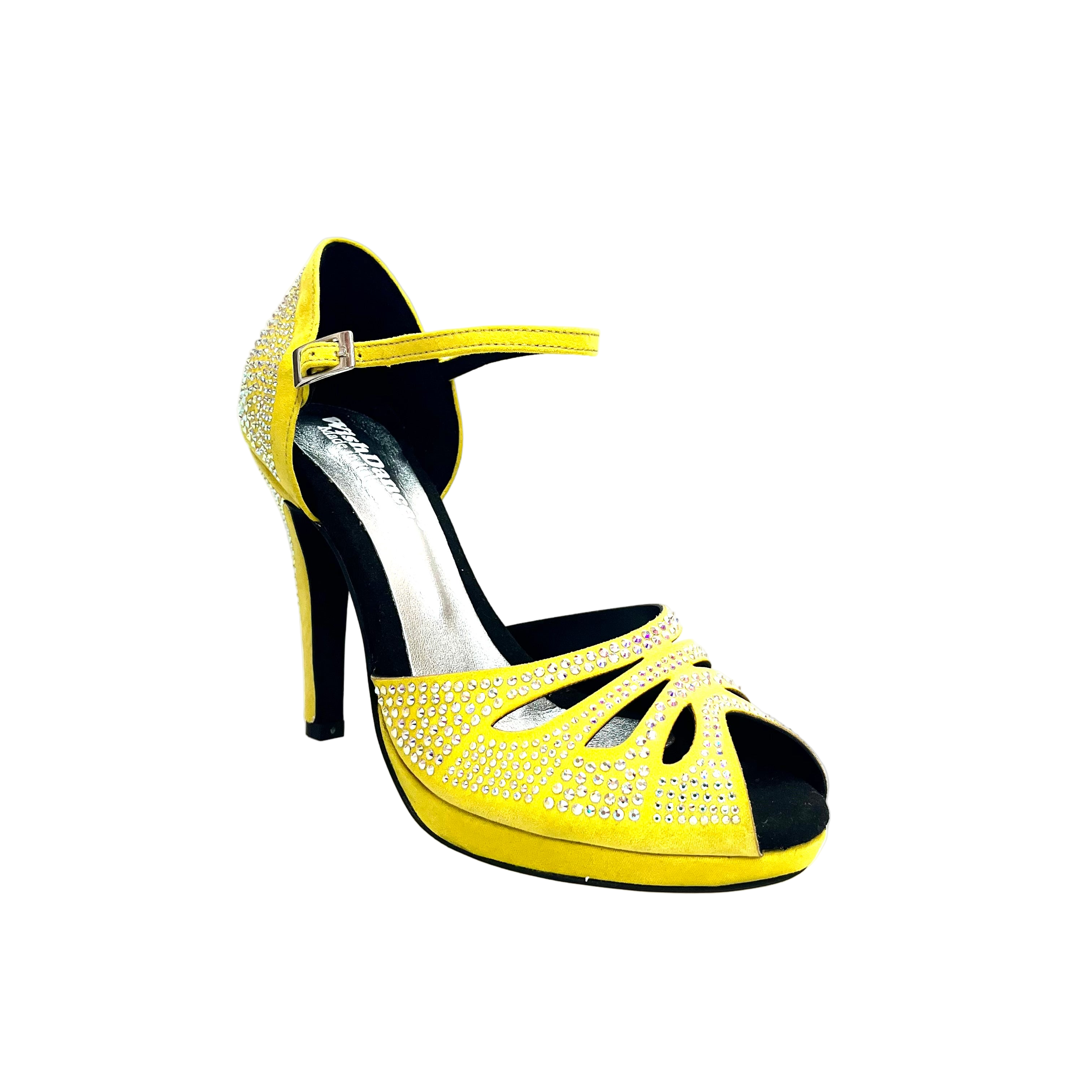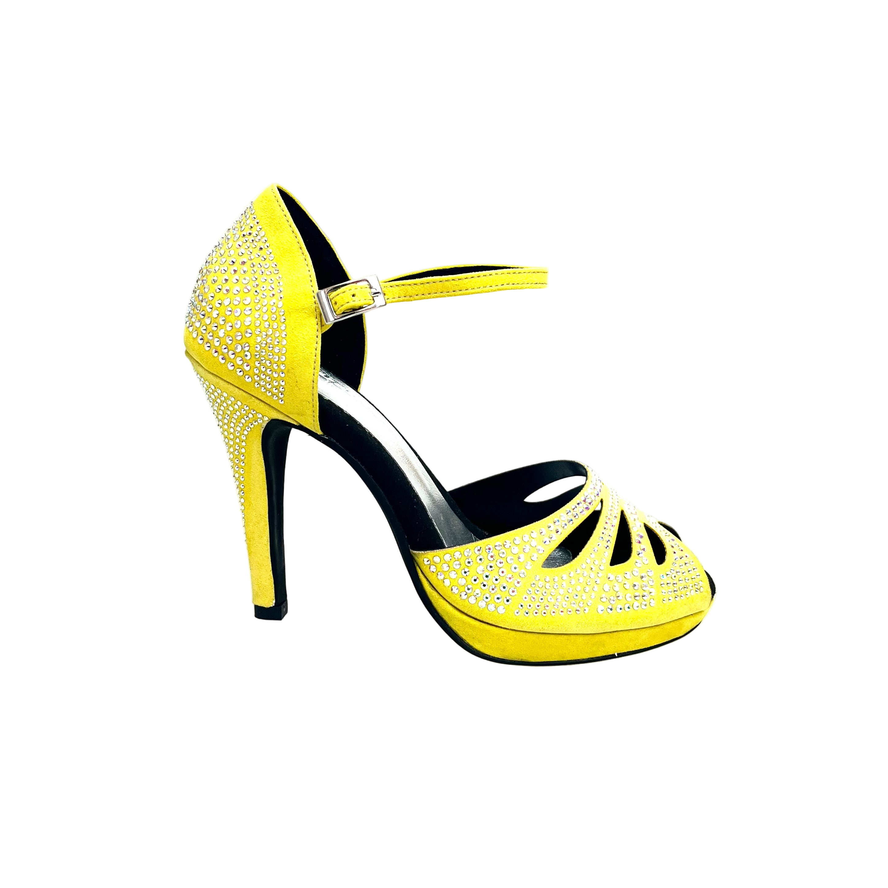Alexa (LP4) - Scarpa da Ballo Camoscio Giallo Fluò Con Swarovski Boreali Tacco Alto Spillo Largo e Platò Confort Flex