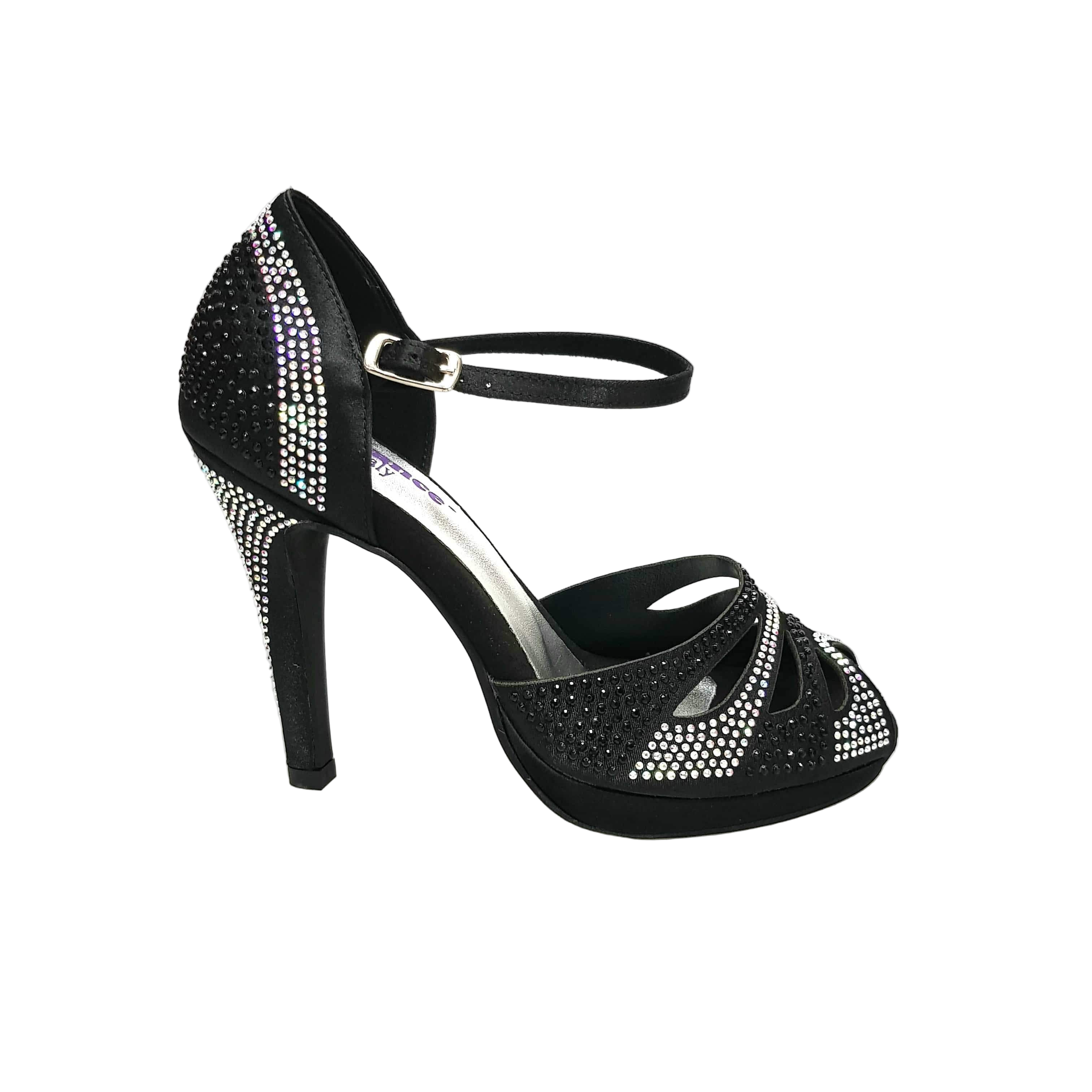 Alexa (LP4) - Scarpa da Ballo in Raso Seta Nero Con Swarovski Boreali e Neri Tacco Alto Spillo Largo e Plateau Flex