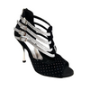 Splendida scarpa da donna realizzata interamente a mano in Velluto Luce Boreale e morbido Camoscio Nero con cinturini in Glitter Argento
