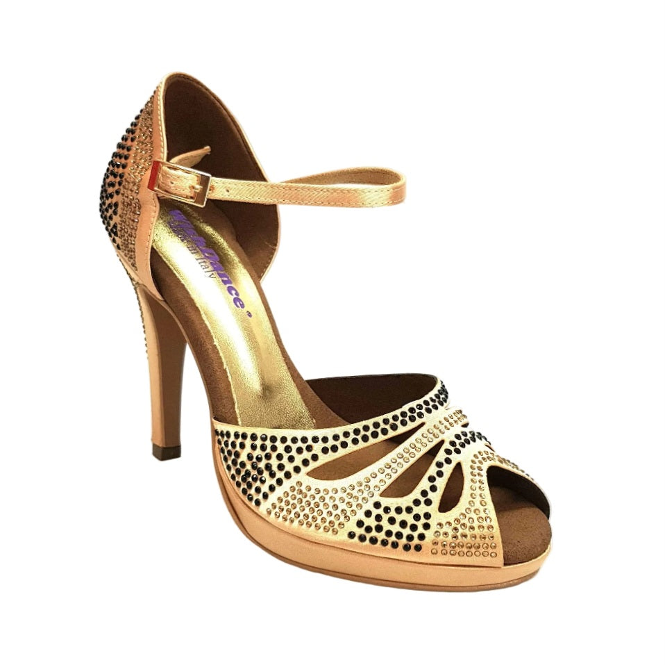 Alexa (LP4) - Scarpa da Ballo in Raso Carne Flesh Con Swarovski Champagne e Neri con Tacco Alto Spillo Largo e Platò Confort Flex