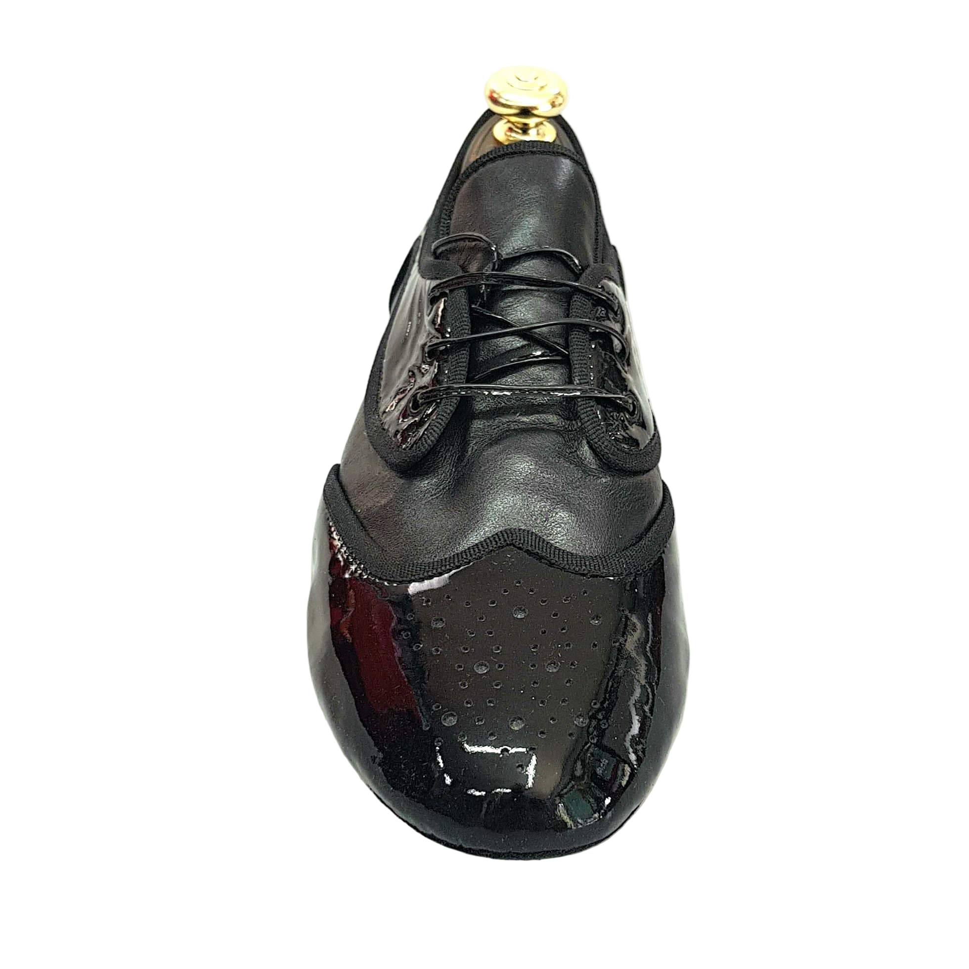 This particular model is made of natural leather and black patent leather, embellished with contrasting reliefs. Black profile