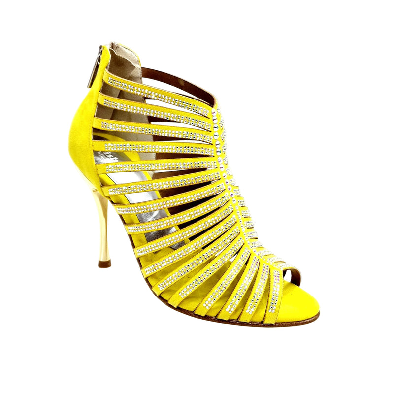Scarpa da donna realizzata interamente a mano in morbido camoscio Giallo con Swarovski Boreali Quantità Plus Tacco a Spillo Laminato oro