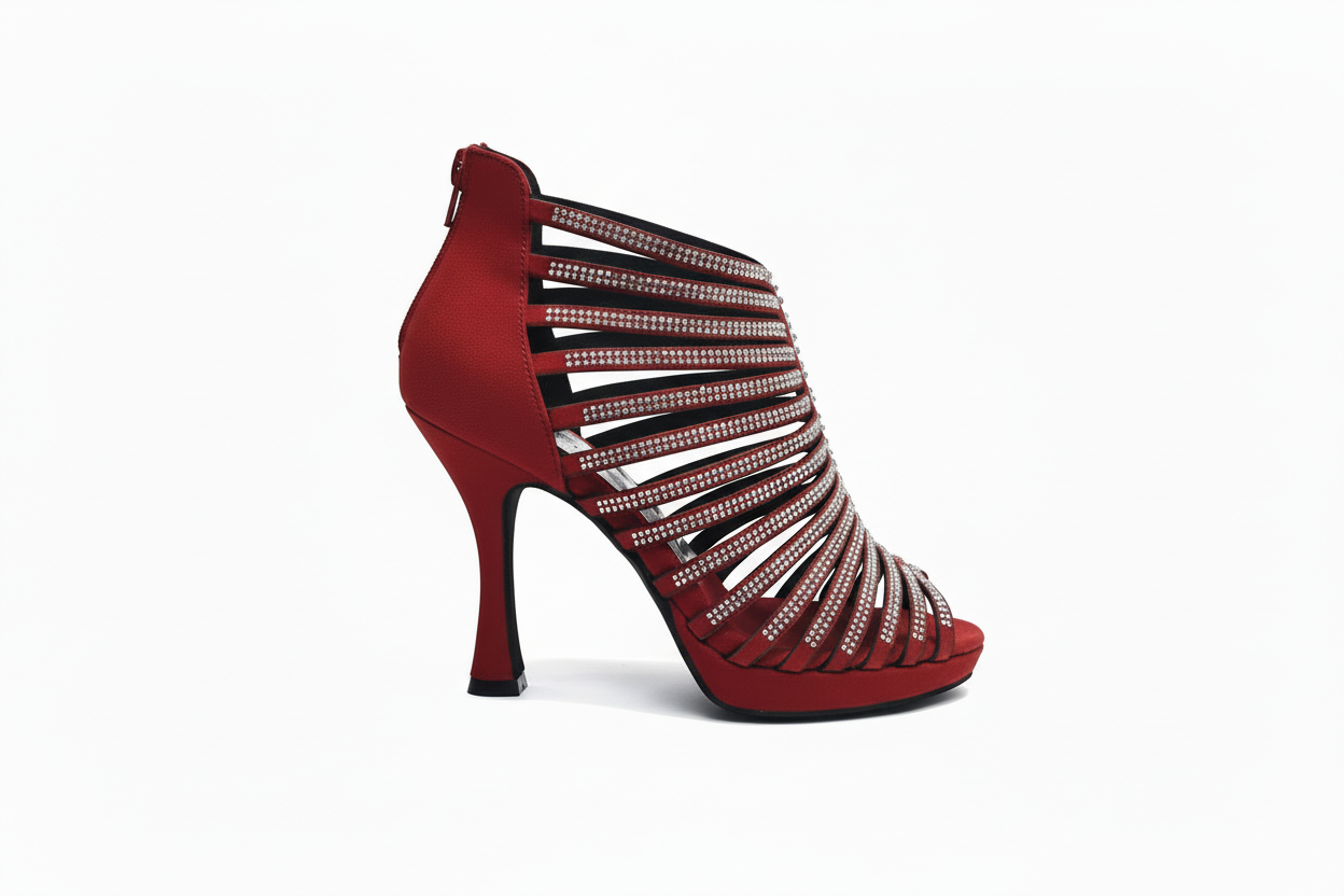 Scarpa da donna realizzata interamente a mano in morbido camoscio Rosso con Swarovski Boreali Quantità Plus Tacco Basso a Spillo Largo con Plateau