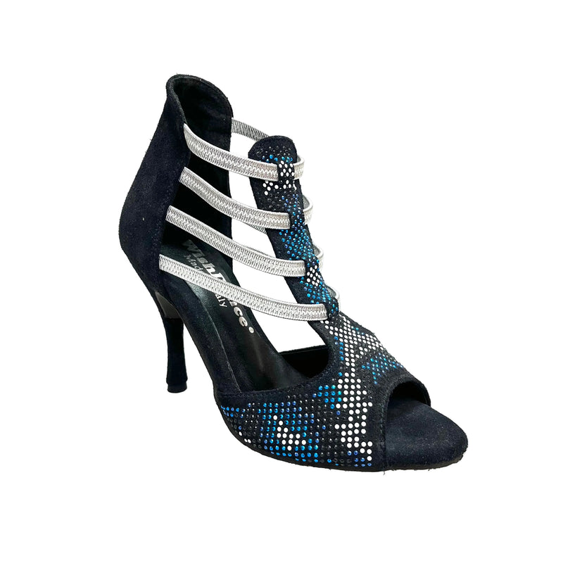 Viper Blu (460PW) - Woman's Sandal in Midnight Blue Suede with livery in blue and white studs and Silver Elastics and stiletto heel Covered in Midnight Blue Suede