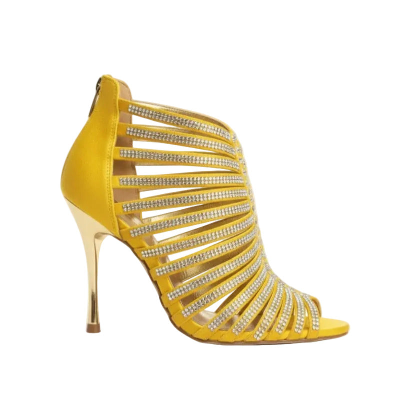 Load image into Gallery viewer, ELSY Plus (L7) - Sandalo a Tronchetto Da Donna in Morbido Camoscio Giallo Con Swarovski Boreali e Tacco a Spillo Laminato Oro