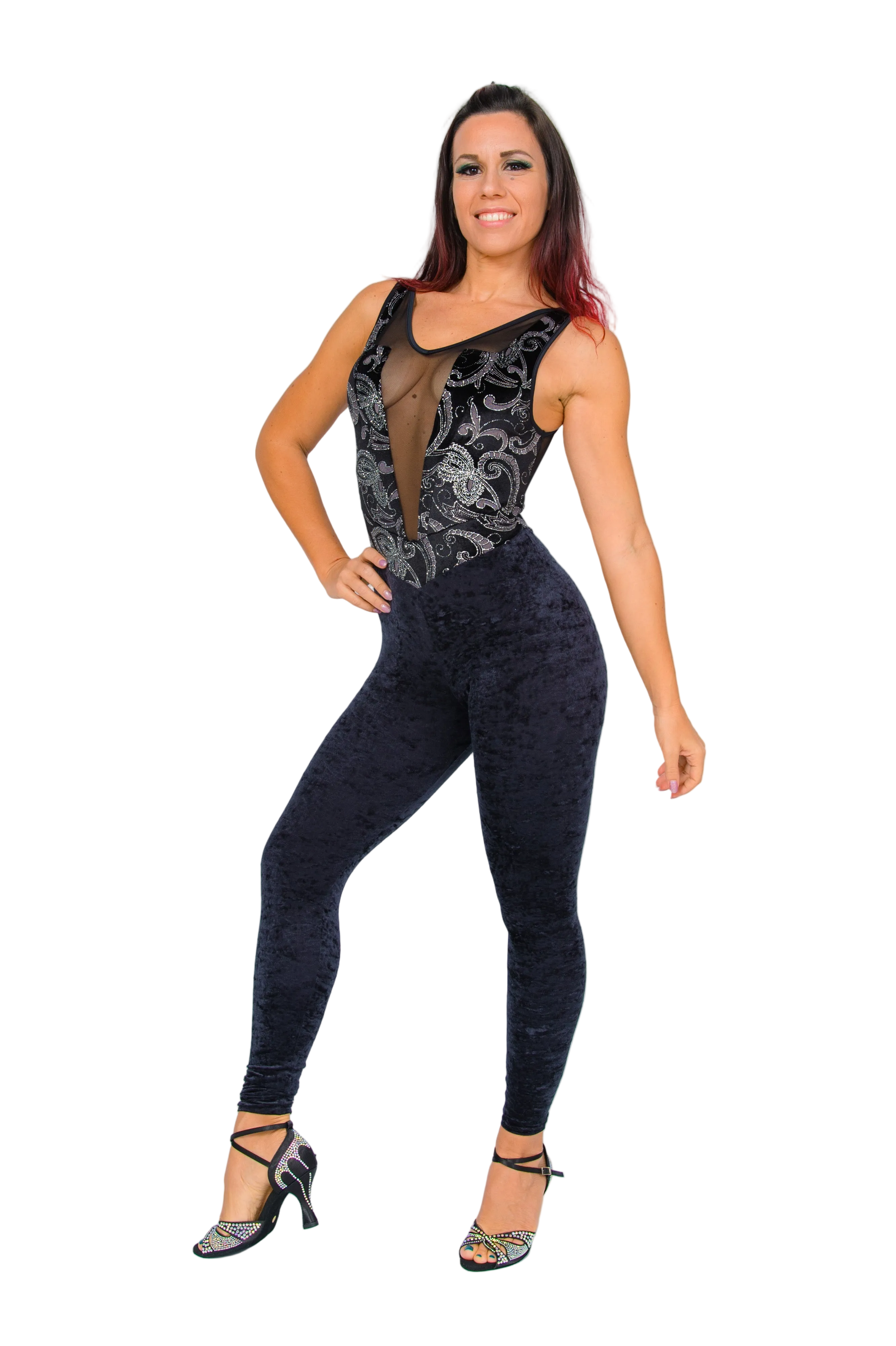 SILVIA Princess (Silver) - Jumpsuit Ciniglia Bielastica Nera intarsi Argento Sopra e Ciniglia Traspirante Bielastica Nera Modellante Contenitiva Containment sotto
