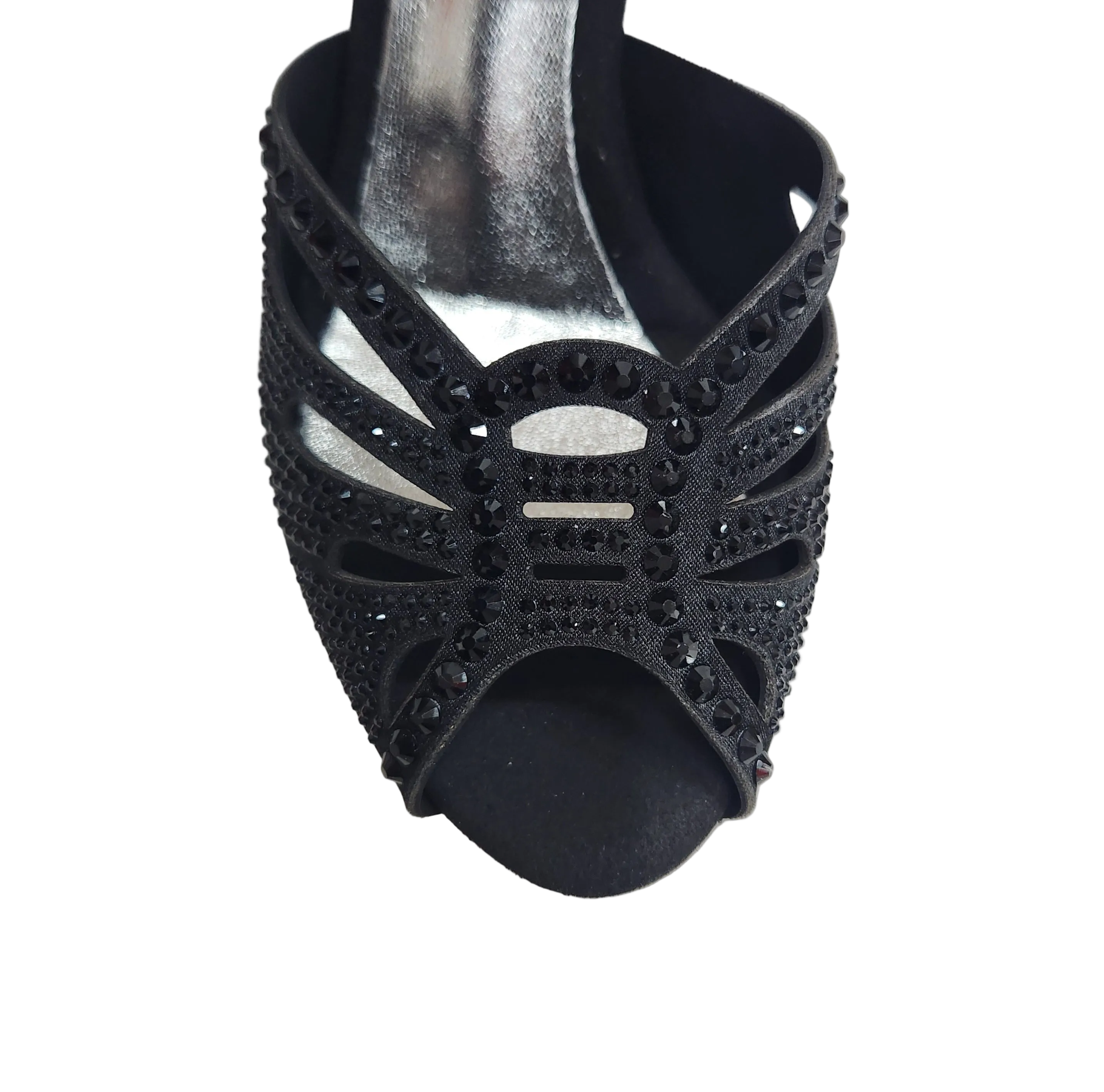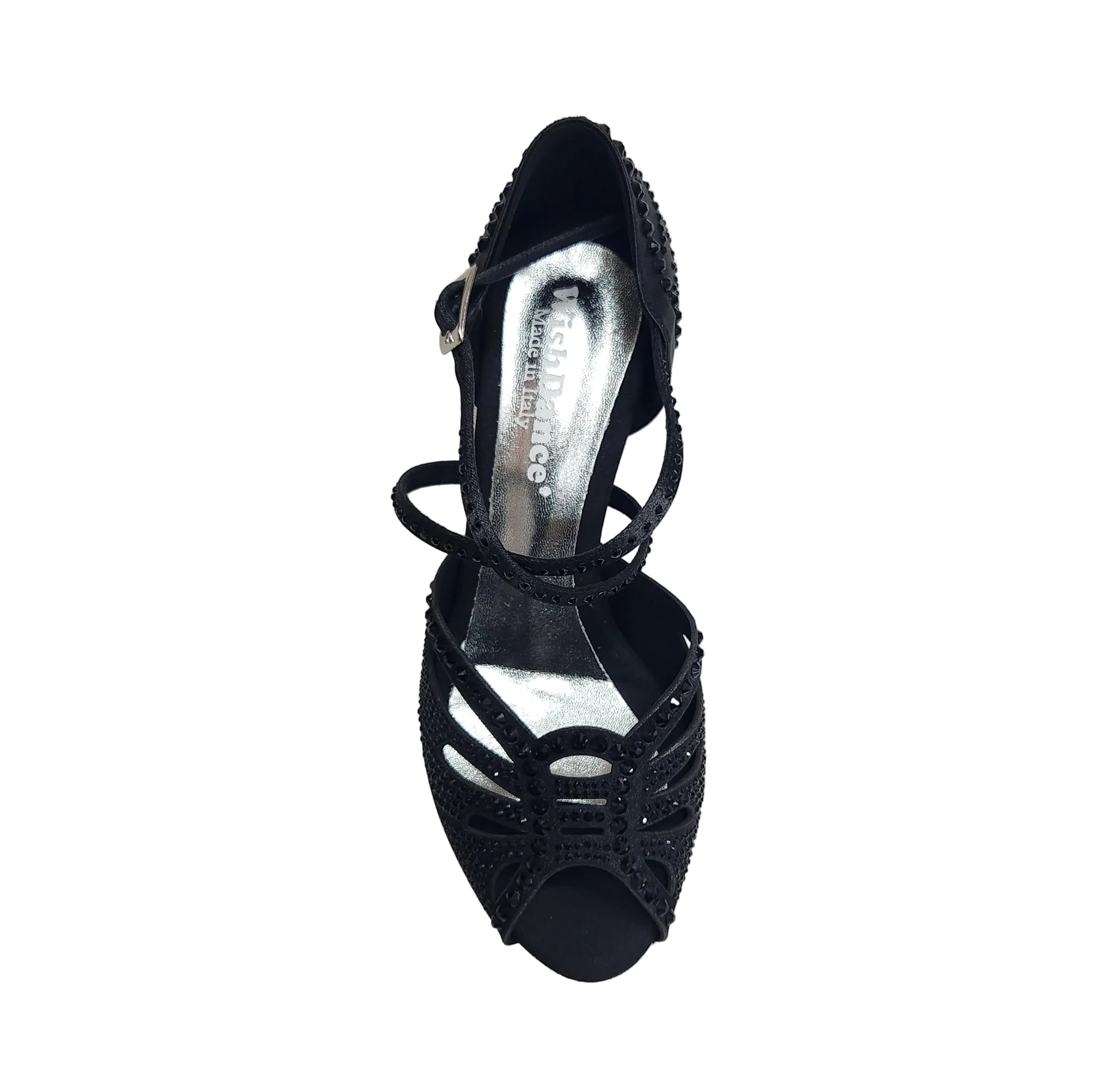 DADA DIAMOND BLACK QC (L55) - SCARPA DA BALLO DA DONNA IN RASO SETA NERO CON SWAROVSKI NERI CINTURINO INCROCIATO SUL COLLOPIEDE TACCO A ROCCHETTO