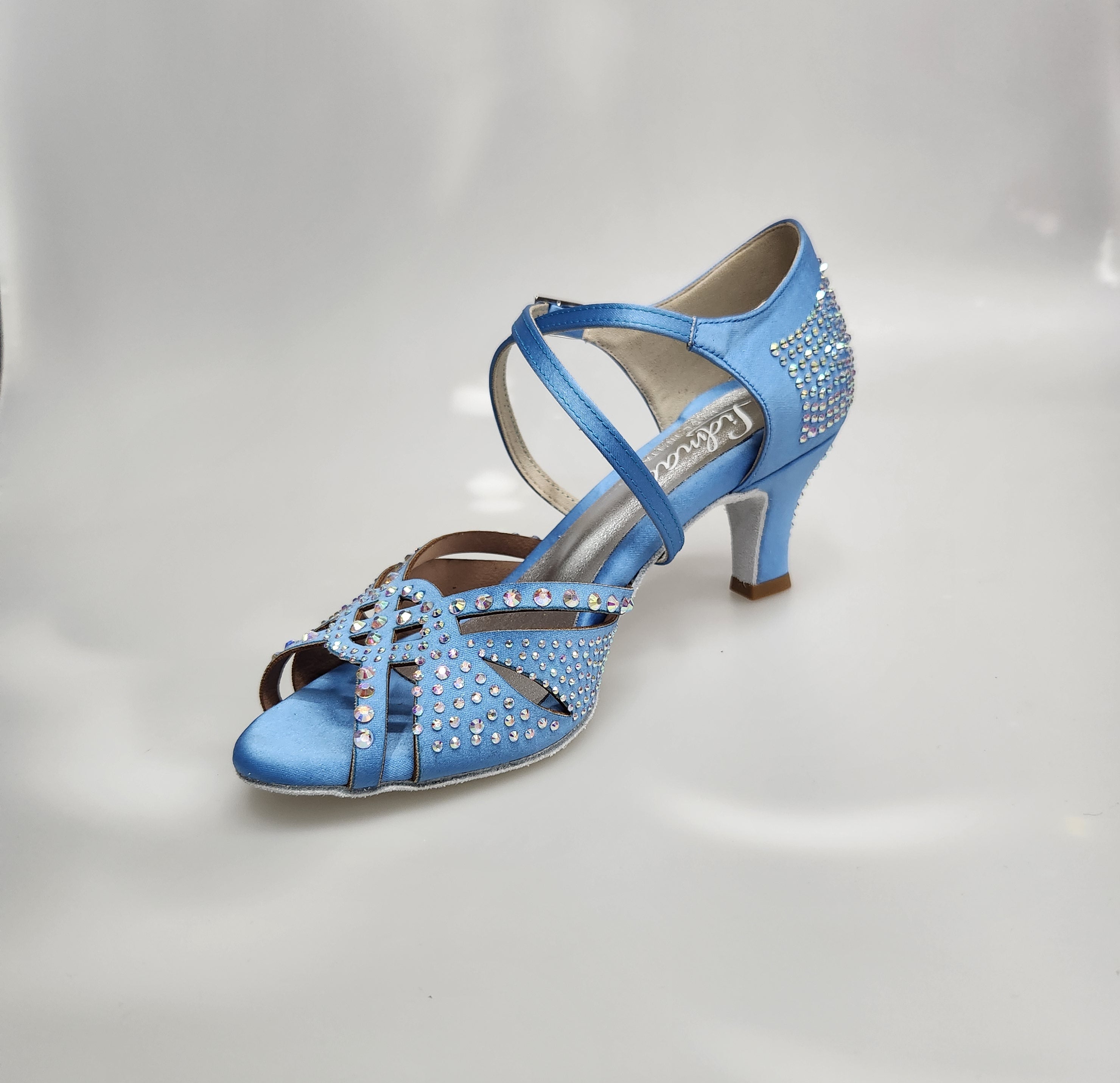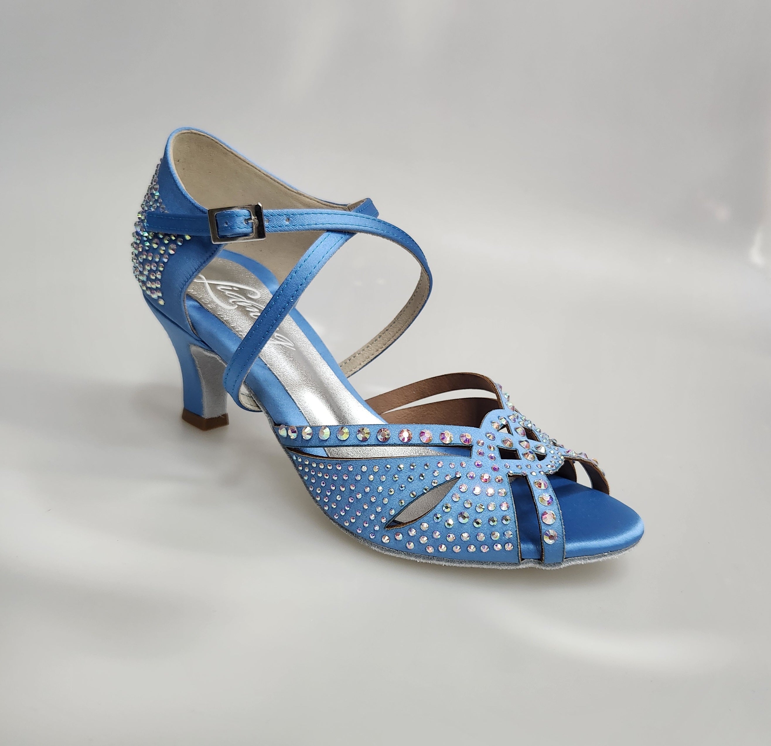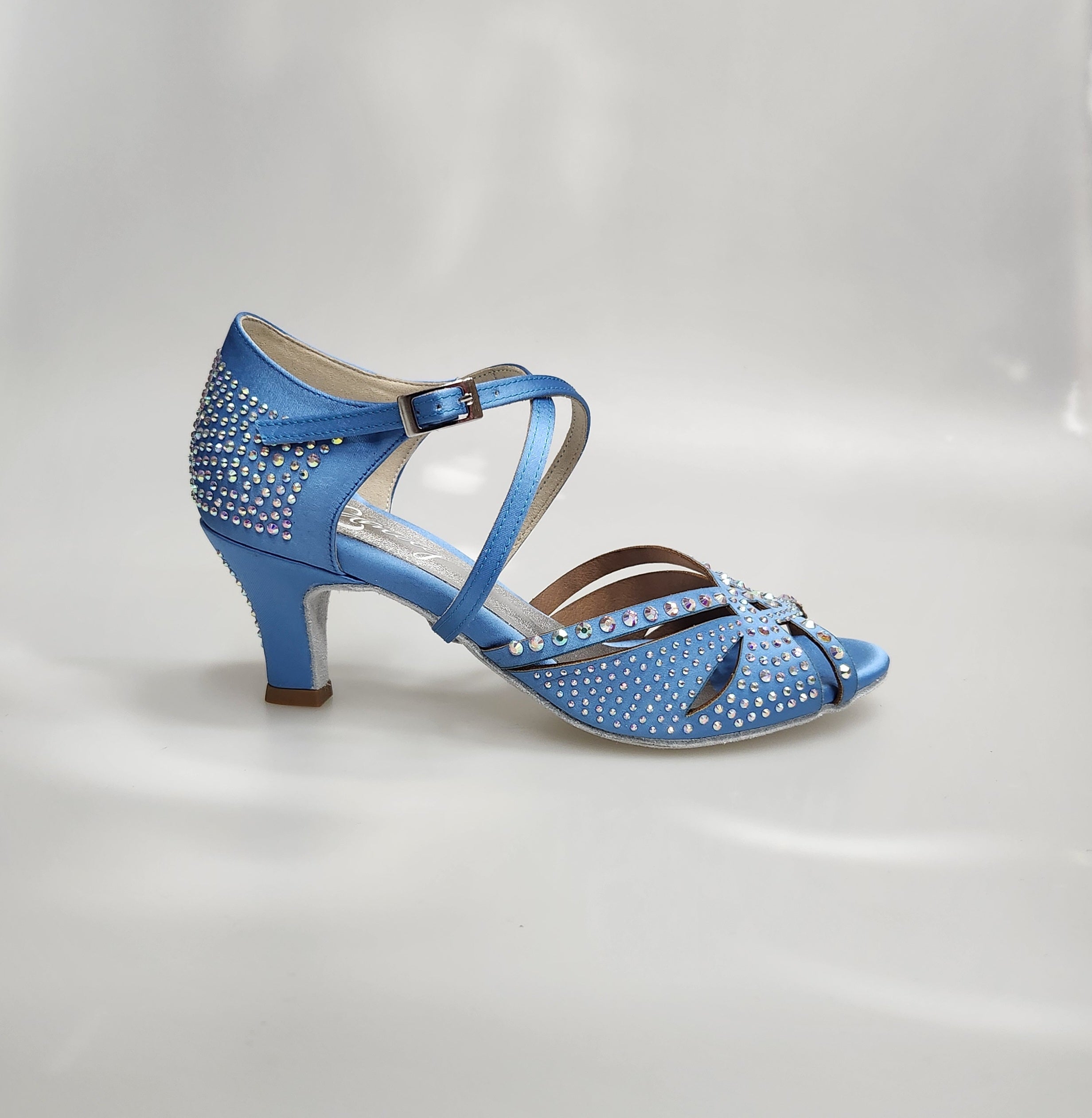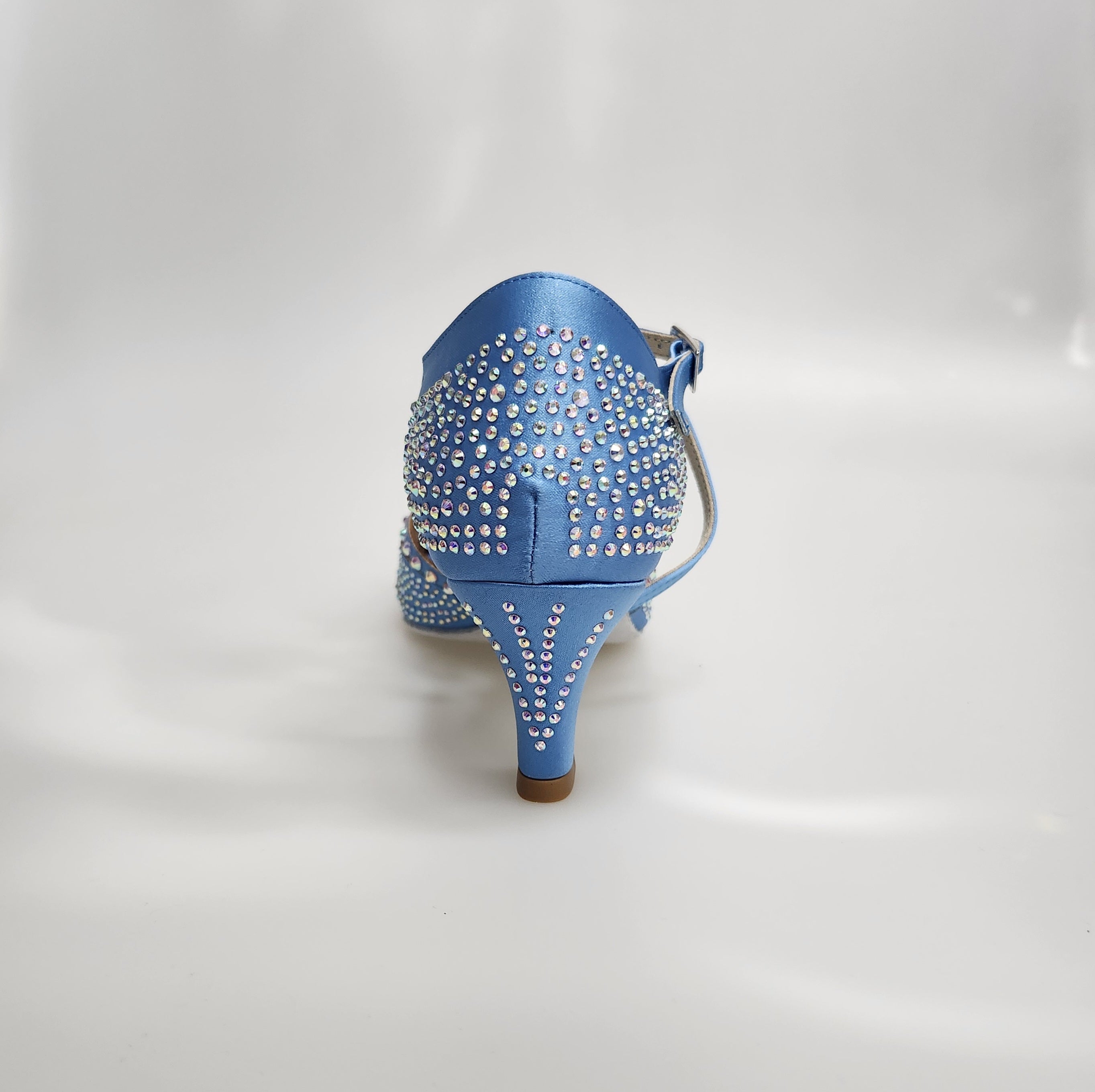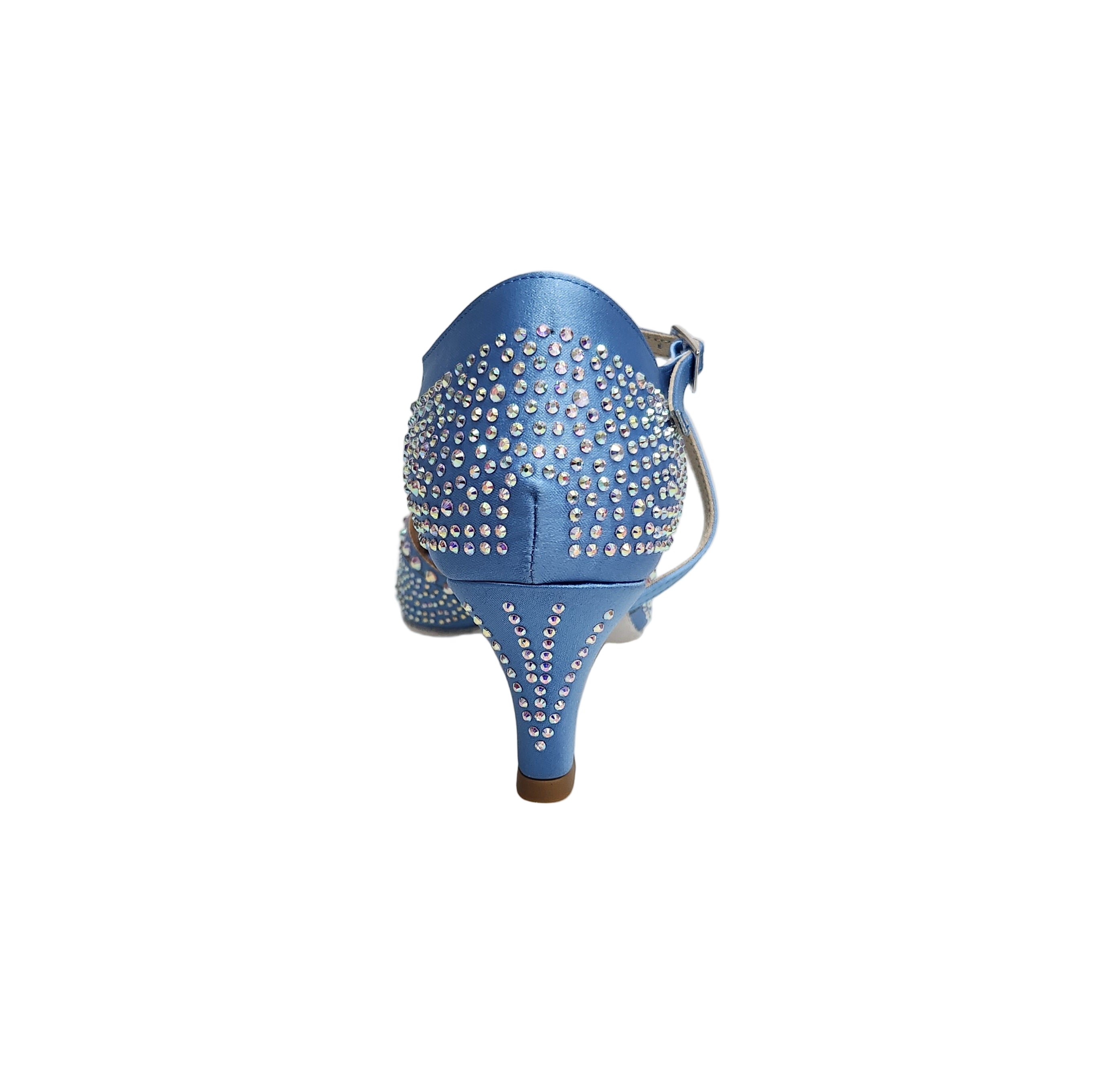 SAMIRA (L19) - Scarpa da Ballo in Raso Seta Azzurro Cielo Con Swarovski Boreali e Tacco Basso a Rocchetto